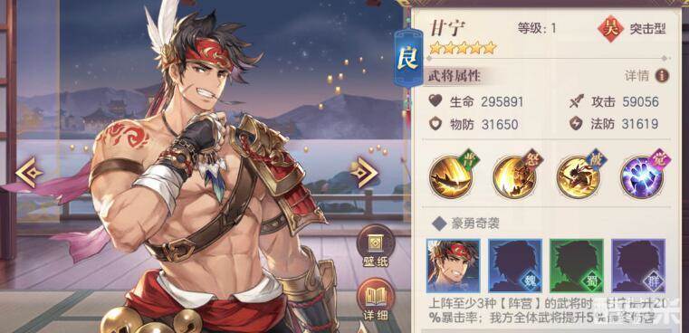 甘宁是吴国的五星的武将,甘宁在战斗中的作用是给敌方的单体目标造成高额的伤害,并且有很强的控制减怒的效果。甘宁的羁绊效果是豪勇奇袭,效果是当场上有三种阵营的武将的时候可以提高甘宁的暴击率,并且还可以提高友方武将的伤害。