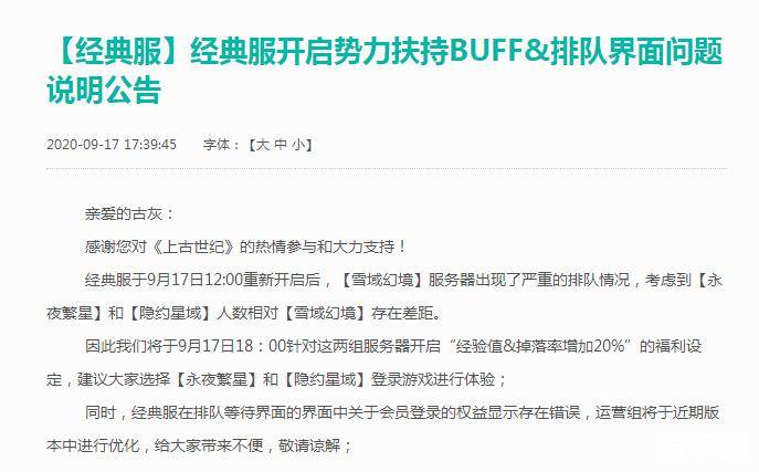 9月16日,开服仅不到一个小时的时间,官方为了服务器平衡不得不发出紧急通告暂时关闭这个区的角色创建功能。9月17日,官方再次启动势力扶持政策,针对永夜繁星、隐约星域两组服务器开启“经验值和掉落率增加20%”的福利设定,鼓励大家选择永夜繁星和隐约星域,以达到更好的游戏体验。
