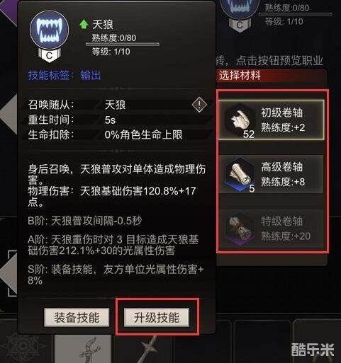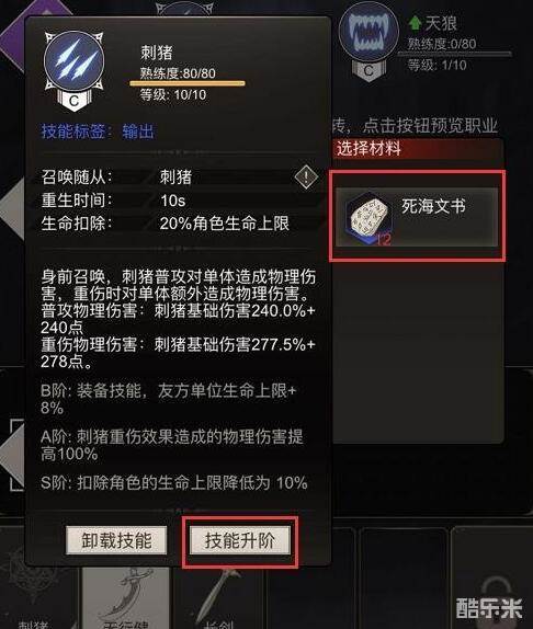 当技能的等级升到满级之后就可以开启技能进阶,还是在职业界面中,选择想要进阶的技能,需要消耗的材料是与技能品质相同的死海文书。