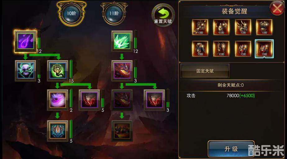 每件装备都有两个觉醒阶段——10阶装备和11阶装备,10阶装备通过完成各种觉醒任务来觉醒,11阶装备则需要10阶装备觉醒等级达到60级后开启。装备觉醒开启后,使用天赋石提升觉醒等级,每提升1级觉醒等级,就会获得1点天赋点,可以提升该阶段装备的天赋树来获得巨额的战力提升,这里注意一下,同一件装备,它的10阶天赋树和11阶天赋树的天赋点是独立的,10阶装备的天赋点是不能提升11阶装备的天赋树的,所以不要想着一直把10阶装备升到60级,天赋点留着等11阶装备天赋树开启后来提升,这是不可行的。