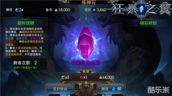 ★获得的神石雏形或神石可进行雕琢,最多4次,分别需要50、50、100、20钻石,雕琢有大成功几率,大成功后奖励翻三倍;雕琢小成功奖励翻两倍,不可继续雕琢。
