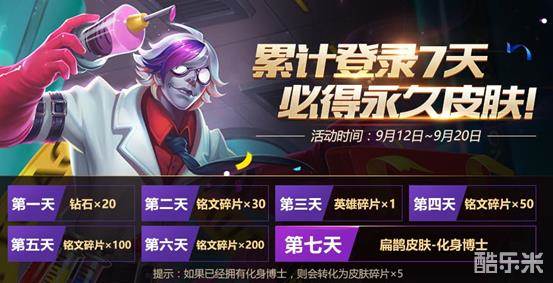 活动期间,登录就送大量奖励!累计七日必得永久皮肤-化身博士(若已拥有,则会转化为皮肤碎片*5)