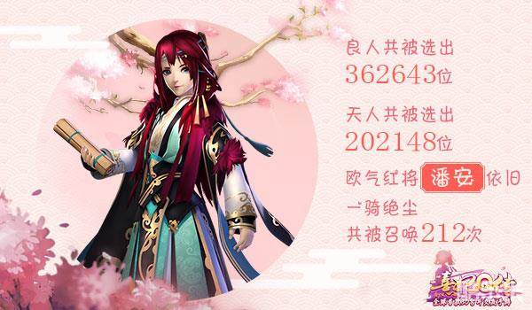 小主们对抽选良人和天人的热情简直让人叹为观止,短短14天中,良人共被选出362643位,天人共被选出202148位。而潘安作为首测的欧气红将,在二测的出现率依旧以212次一马当先!
