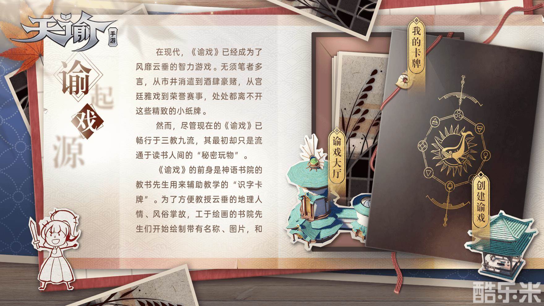 卡牌小白初长成 斗智斗戏多欢乐! “谕戏”的前身是云垂教书先生发明的精致小卡片,上面印有各种地理人情和风俗掌故,后来被神语书院的学生加以编纂,变成了一种益智类卡牌游戏。数年之后,它衍生出了点数系统,休闲的智斗玩法也渐渐风靡苏澜,甚至还收获了一批忠实粉丝。常居苏澜的巴叔就是谕戏狂热者之一。通过他,不仅能解锁谕戏玩法,更有机会通过打牌获得冒险成就和珍稀藏品。闲散之时,打上酣畅淋漓的几局,岂不快哉!