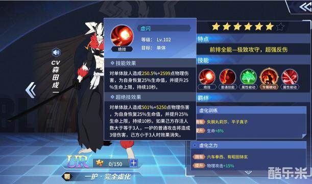 作为《BLEACH 境•界-灵压对决》推出的第一位防御UR角色,一护•完全虚化掌握了迄今为止防御系角色中最强的绝技/超绝技,单体伤害系数高,附带25%的回血和增加25%的生命上限。超绝技中存活角色大于等于3人,额外造成3倍普攻伤害(人数不够3人即消失)的效果往往令敌方胆战心惊。凭借这个绝技,一护•完全虚化在前排能站得非常久,配合专属被动,反弹伤害惊人。