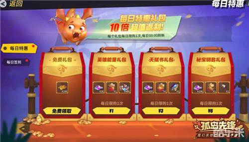 本周更新后,每日将有特惠礼包送来10倍超值返利惊喜!玩家每日上线后即可领取免费礼包,超低价入手英雄能量礼包、天赋书礼包、秘宝钥匙礼包,开启即可获得大量橙色武器碎片、稀有坐骑碎片等珍贵道具,解锁稀有外观,加速英雄养成!