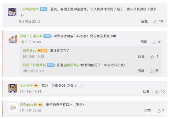茶话会中,有不少制作人纷纷留言,从大家的评论中,不难发现小偶像们分为两类,一类是厉害的学霸,一类是满篇错题的学弱……不知道你推的偶像是什么样的?