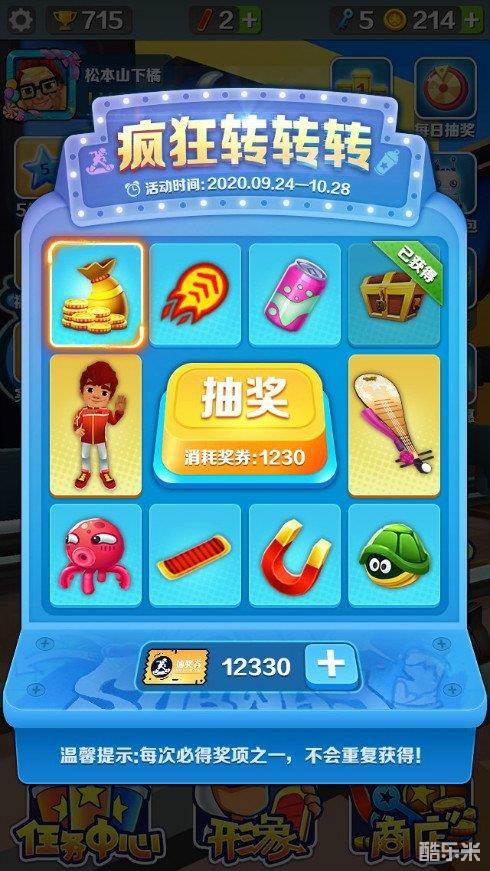 既然是两个节日遇到一起,那么游戏的福利岂能少呢?除了“跑酷秘典”带来的丰厚奖励外,《地铁跑酷》首次上线了一个节日限定的转盘抽奖活动——疯狂转转转!