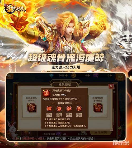 比如手游中,人人都趋之若鹜的一套深海魔鲸魂骨,具备2件提升攻击5%、3件伤害减免7%、4件生命提升10%伤害加深5%的作用。而且该魂骨升级到SS级后,更是可以增加200攻速,伤害加深提升到20%,伤害减免25%,还有攻击20%。可以说各种属性提升后,深海魔鲸套堪称新斗罗手游最强魂骨。