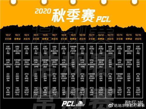 2020PCL秋季赛常规赛将于10月2日至10月16日进行,来自艾伦格、米拉玛和维寒迪三大赛区的24支战队,将进行为期15日的积分循环赛,每个比赛日进行6局比赛,比赛于每日北京时间16:00开始。