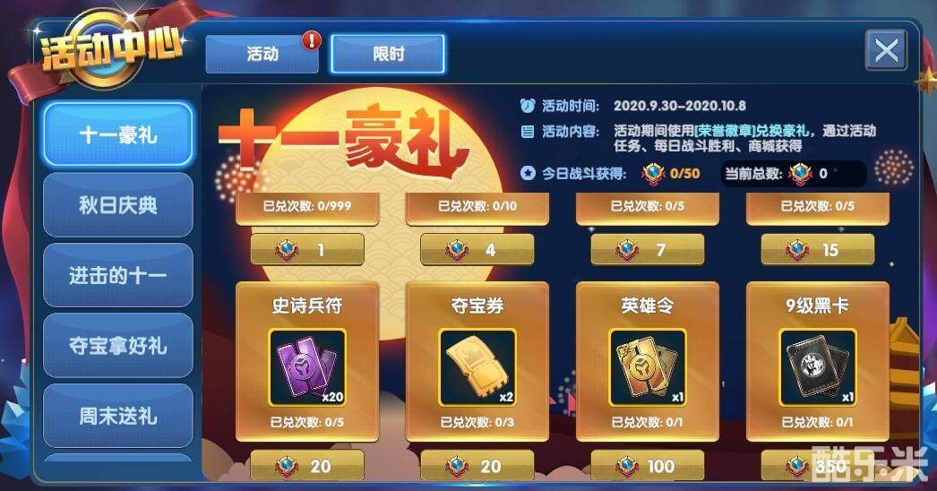 随着S2赛季的开启,也进入了一年一度的国庆中秋长假,这个国庆,我们准备了丰富多彩的活动,陪你欢乐度过!全新道具英雄令,让你兑换制定英雄碎片,助你快速升级!
