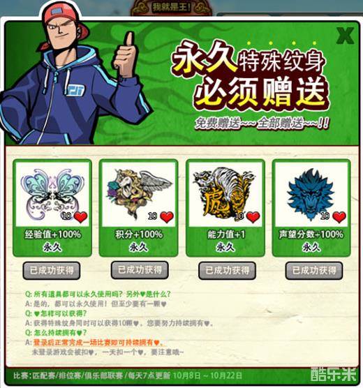 活动规则:活动以账号为单位进行。活动期间内可直接在活动界面领取4个永久纹身。