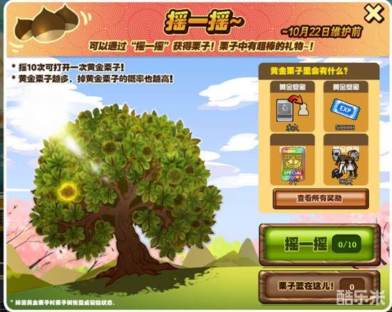 活动规则:玩家可以在活动界面通过“摇一摇”获得栗子。每个栗子中都有道具奖励。摇满10次就可以开出黄金栗子。黄金栗子越多,摇下黄金栗子的概率也越高。摇掉落黄金栗子将必定获得黄金道具。摇下黄金栗子,栗子树就会回到初始状态。