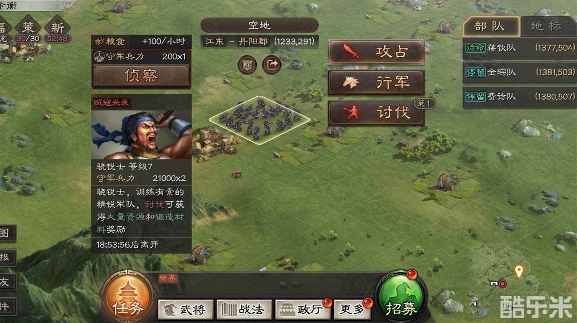 骁锐士,等级7级,训练有素的精锐军队,守军兵力21000*2。讨伐可获得大量资源和锻造材料奖励。