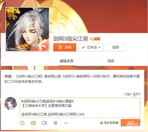在#剑网3指尖江湖[超话]#中发帖,带#指尖课堂# +【任意学院名称】(跨校社团活动可不加学院名称) 话题投稿内容并@剑网3指尖江湖 @剑网3指尖江湖同人bot