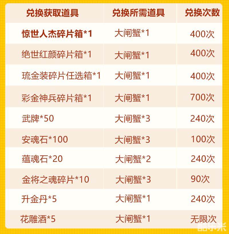 「大闸蟹」可用来兑换惊世人杰碎片箱、绝世红颜碎片箱、琉金装碎片任选箱等稀有资源: