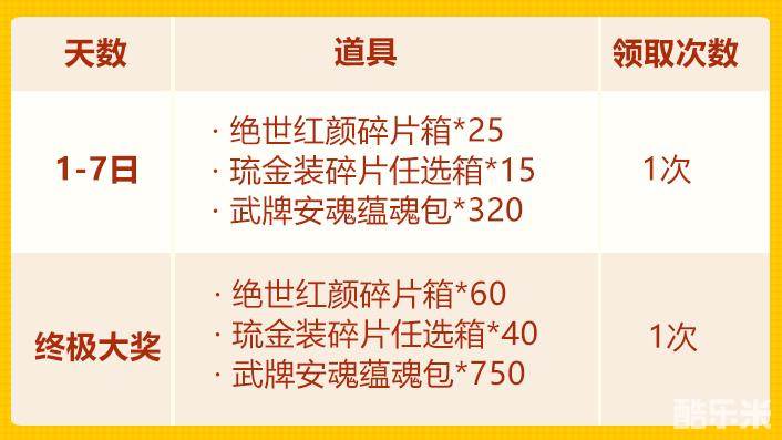 1-7日可领取:「绝世红颜碎片箱」*25 或 「琉金装碎片任选箱」*15或「武牌安魂蕴魂包」*320