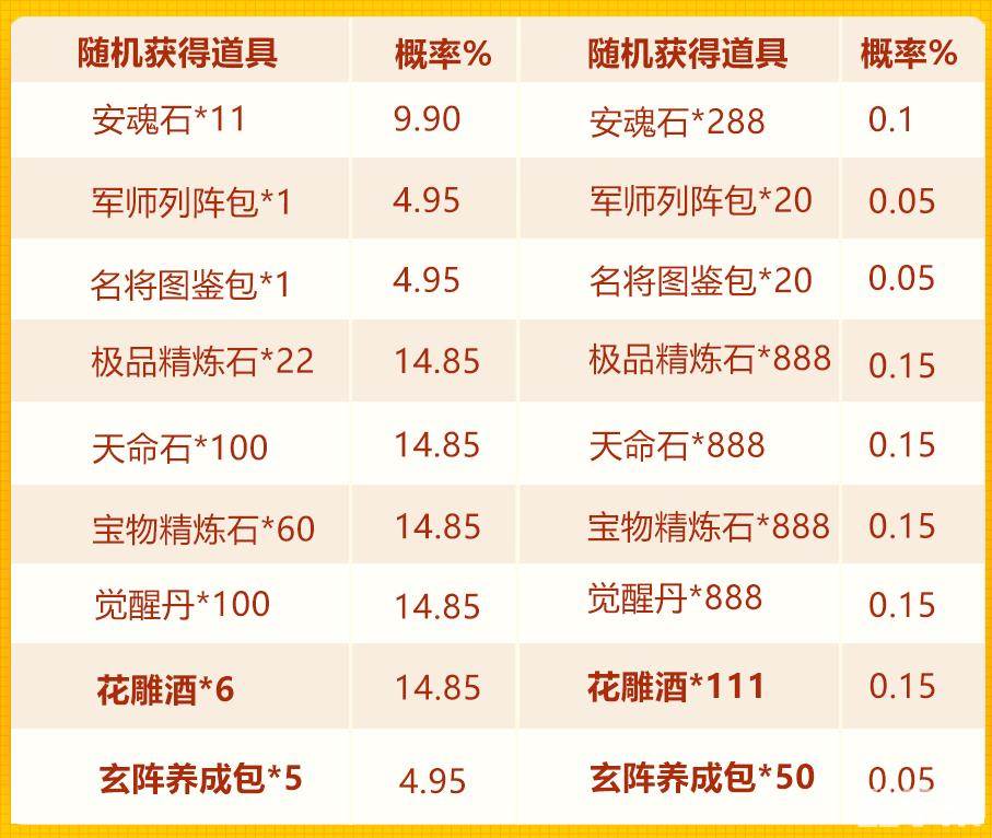 3.「晚秋礼盒」可开出:花雕酒*111、玄阵养成包*50、觉醒丹*888、天命石*888、极品精炼石*888、安魂石*666、军师列阵包*40、名将图鉴包*40、宝物精炼石*888、花雕酒*6、玄阵养成包*5、觉醒丹*100、天命石*100、极品精炼石*22、安魂石*11、军师列阵包*1、名将图鉴包*1、宝物精炼石*60中的随机1种。