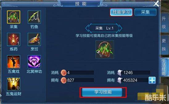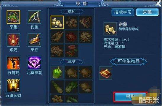 采集流程:点击采集图标,在中间物品框中选择要采集的对象,点击采集按钮后可自动寻路到采集地点。