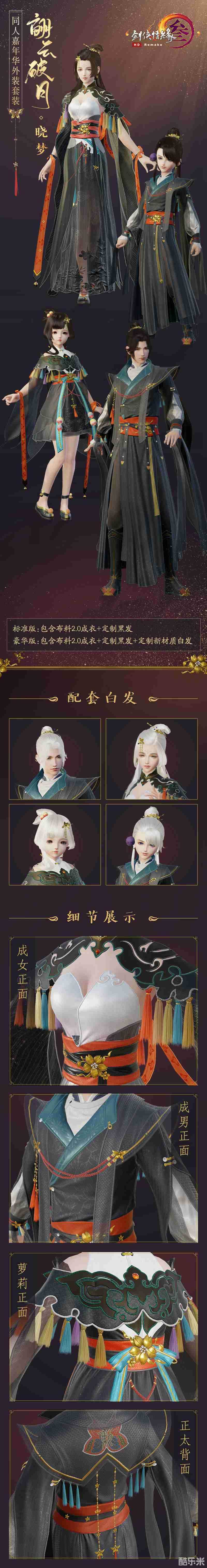 “翩云破月·晓梦”以经典黑红金三色配色,呈现华美绝伦的惊艳表现!成女款黑色蝶翅长裙和袖子让本就绚丽的彩色云肩更加庄重华美,超凡脱俗!萝莉款加入戏曲元素绒球的同时,搭配蝴蝶结腰封,使人更觉俏皮可爱!成男款则在保留蝴蝶主题与戏曲风格的基础上,以唐朝男装制式设计,尽显大唐儿郎英雄胆!正太则选用颇具戏曲特色的绒球头饰做点缀,增添童趣!