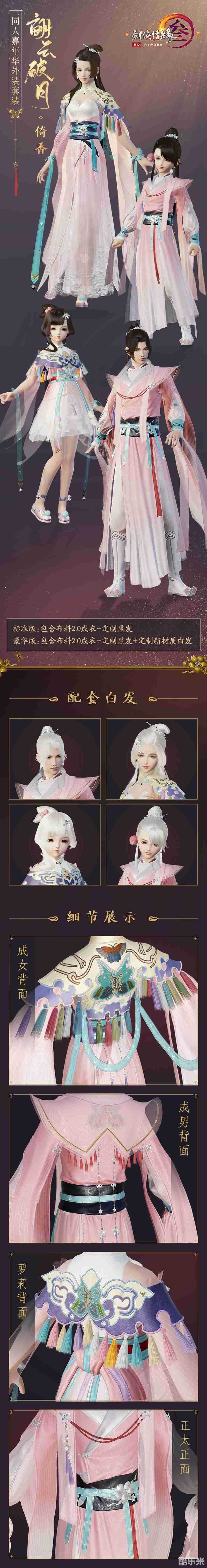 同人嘉年华外装套装“翩云破月”共推出两款偏色,并针对侠士们的不同需求,每款配色均量身定制推出了两款配置不同的套装以供侠士选购!标准版套装内含布料2.0成衣与定制黑发,而豪华版则包含布料2.0成衣、定制黑发与定制新材质白发。