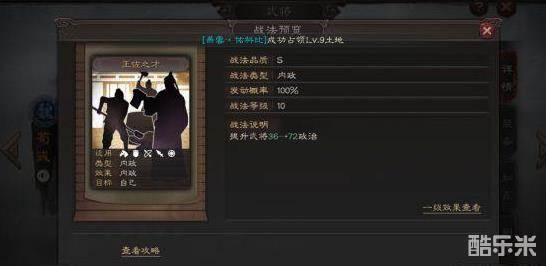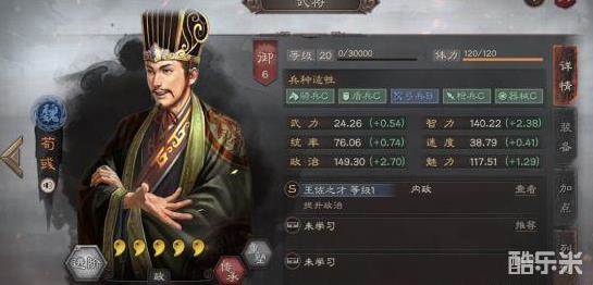 在战法搭配方面,能够提高政治属性的【简政】和【见机行事】能够与荀彧的定位完美契合,提高荀彧的政治属性,从而更好地发挥他的内政官员的作用。