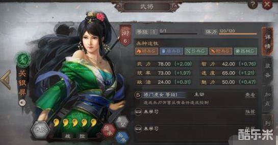 关银屏传承了其父关羽枪、骑S的兵种适性,武力、统率、速度也都处在一个较高的水平,可作为一名主力输出武将。