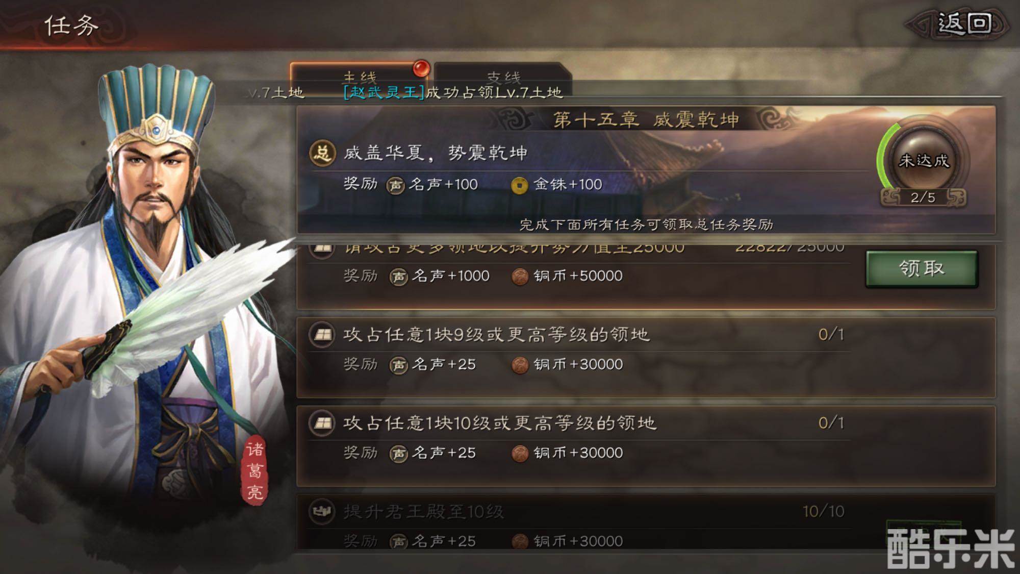 2.攻占更多的领地以提升势力值至25000 奖励为:名声+1000 铜币+50000