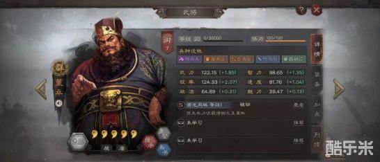 史书里董卓武功高强,尤擅骑射,可左右开弓。在游戏里面董卓的属性也不弱。武力成长1.85,智力成长1.35,统帅成长2.07,速度1.04。在兵种适应性上面也是盾弓双s,骑兵a。缘分方面有美人连环计和太师动乱等。