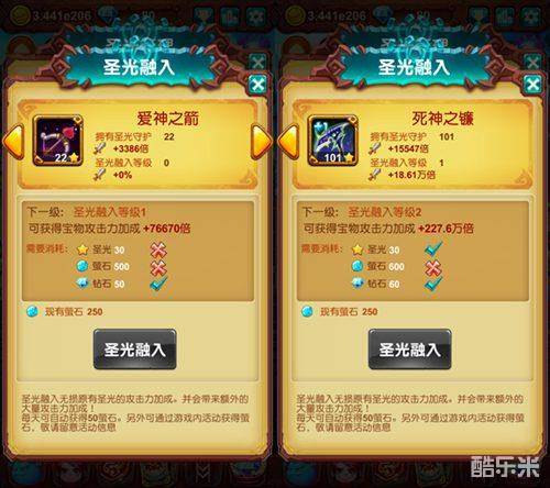 当然想要将圣光融入进宝物之中,还是需要消耗一些资源的。首先需要宝物之上有30圣光的照耀效果,还需要一定数量的萤石。如果第一次进行圣光融入那只需要500萤石即可,再次进行则需要600萤石,勇者们在融入前一定要仔细查看,最后需要的则是一定数量的钻石,毕竟如此强势的工艺技术,不付出一些金钱怎么能行呢?当然对于勇者们来说,消耗的钻石绝对比不上增加的攻击力重要!