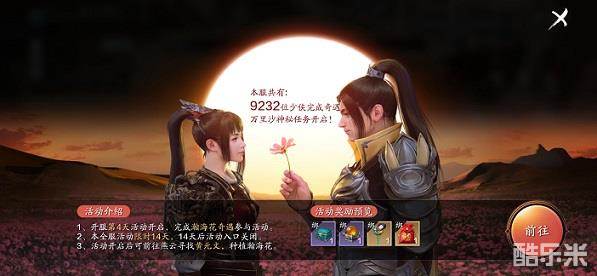 知道大致的情况以后我们自动寻路去月牙泉找黄元文,二人因为国家大事没有成婚,但是二人誓约当沙漠里能有一片花海的时候就结婚,接下来就是我们少侠么们的任务啦,每个少侠都可以接受任务,种下花种,为天下有情人做出一份贡献。