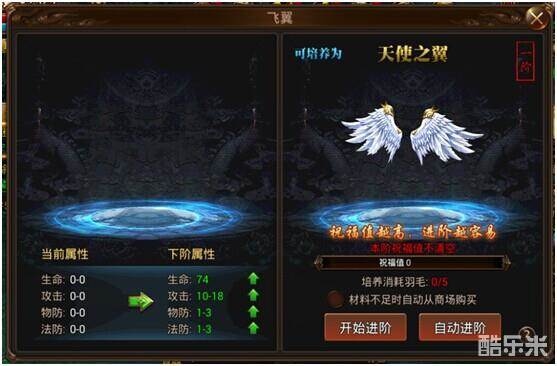 等级达到65级后开启飞翼系统,通过进阶飞翼可以增加人物的生命,攻击,法防,物防属性。