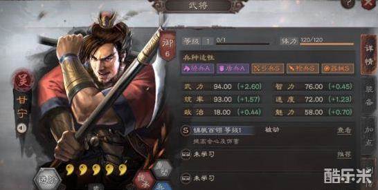 甘宁面板属性极其华丽,其武力和速度在众多武将中都属于顶尖水平,更是少有的3S2A兵种适性武将,属于比较全能型的悍将。