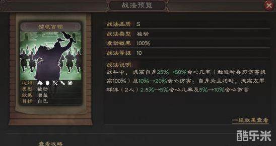 被动提高自身会心几率及伤害,身为主将时还可提高队友的会心几率和伤害。简单的自身增益战法。