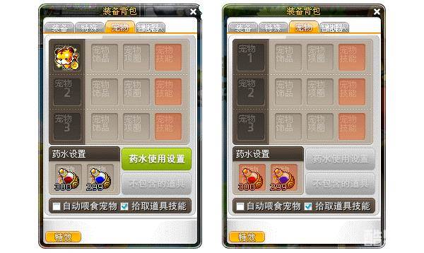 在系统相关的方面也做了相应的调整,例如:若玩家使用了具有自动服用HP/MP药水技能的宠物,并设置了宠物自动服用的药水,那么当玩家不再使用宠物时,保留相关药水的设置,药水转为未激活状态。