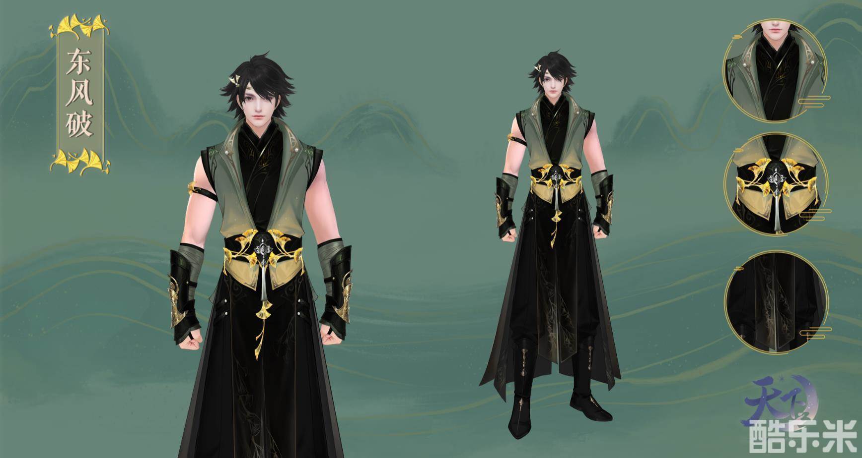 露肩、短裙、阔腿裤,《天下3》全新民族风时装“东风破”打破秋冬沉闷!其中,男女装皆以“银杏”为主要设计元素。男装一身墨色无袖长袍,下半身裁作向前半开的阔脱裤样式,其写意潇洒之态,颇有改良式汉元素服装的国风风范。长袍外穿一件青竹色立领坎肩,露出肌肉线条修长优美的左右臂膀,真正“脱衣有肉”。腰间更系着一条金色银杏叶做成的腰带,在点亮整体色彩的同时,又提高整套搭配的格调,尤显少年意气!