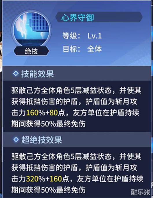 驱散己方全体角色5层减益状态,并使其获得抵挡伤害的护盾,护盾值为斩月攻击力的百分比,友方在护盾持续期间获得50%最终免伤。