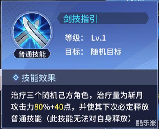 治疗三个随机己方角色,治疗率为斩月攻击力的百分比,并使其下次必定释放普通技能。