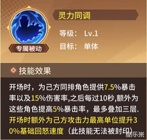 开场时,为己方同排角色提供7.5%暴击率(100级为15)以及最大值15%伤害率(100级为30),之后每过10秒,额外为这些角色提高最大值5%暴击率(100级为10),最多叠加三层,6星后,开场时额外为己方攻击力最高单位提升30%基础回怒速度。