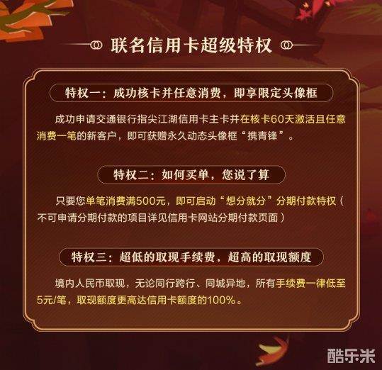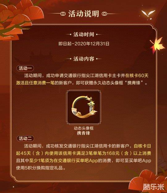 万众瞩目!《剑网3:指尖江湖》x交通银行联名信用卡来啦!即日起-2020年12月31日,前往交通银行活动页面进行申请,即可获得《剑网3:指尖江湖》定制联名信用卡,黑金配色尽显尊贵,超人气侠客叶英跃然于卡面,不仅实用,更具收藏价值!此外,参与活动更有永久动态头像框“携青锋”相赠,开办新卡更享诸多尊贵特权!