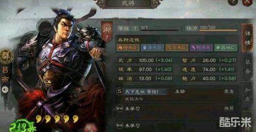 可以看到吕布武力基础值是满值100,且成长高达3.04,速度也是非常快,缺点统帅很一般,智力硬伤。