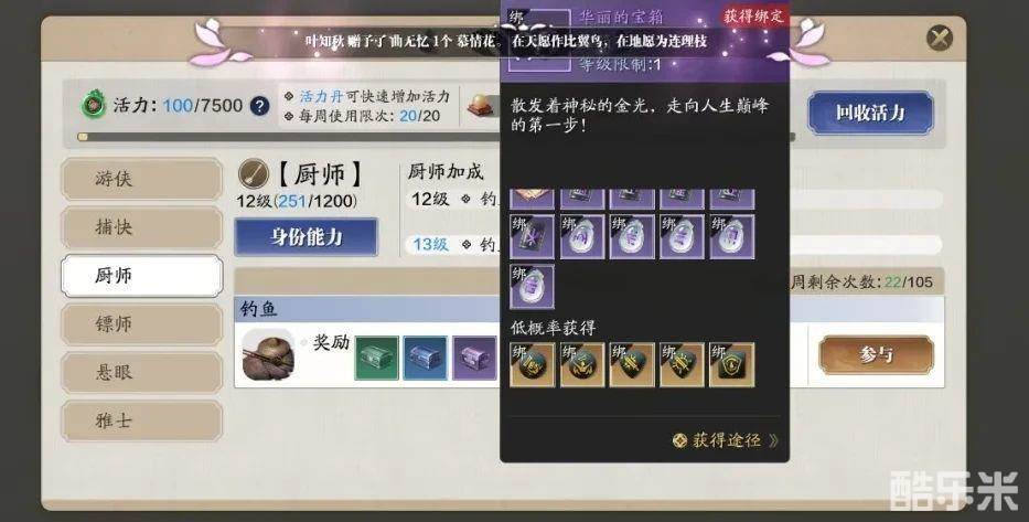 厨师:通过采集各种食材烹饪食物,食用给予增益buff,属性很可观。没周提交食材或食物给帮派会最多可获取帮贡1400点和修为490W,这是一个极其可观的数字,也是一定要学习的身份,没有之一。