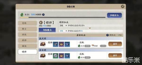 玩家达到37级之后就可以解锁身份系统,同时作为日常镖的威武镖和安全镖两种玩法也同时解锁,这两种玩法的模式非常接近,最大的区别在于消耗的资源和获取的道具,安全镖只需要消耗450活力即可,获得的奖励也是碎银。而威武镖则需要消耗一枚镖旗,奖励则是用玩家间流通的银两发放。