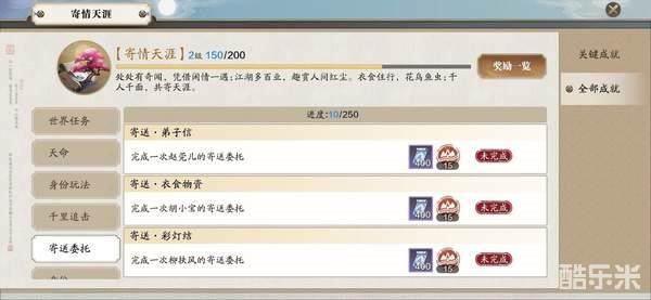 在手游中押镖还会有一个寄送物件的信息,每一次押镖都相当于是一次寄送委托,每次委托都是随机的,完成相应的寄送委托之后还可以在成就系统中领取绑定点券以及大量碎银的奖励,这里的奖励可谓是非常的丰厚,最起码也是20万的碎银,甚至还有几个400绑点奖励的成就,这些奖励也激励着玩家更多的去完成押镖。