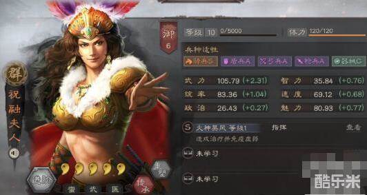 我们都知道一个武将到底是带什么兵书,主要还是看三维属性和自带战法的效果!从属性面板可以看出,祝融夫人的武力值是最高的,再看看自带的战法可以看到她的战法受到武力值的影响,所以肯定是全武力加点,这样的话我们在选择战法的时候主要是选择兵刃输出战法为主。
