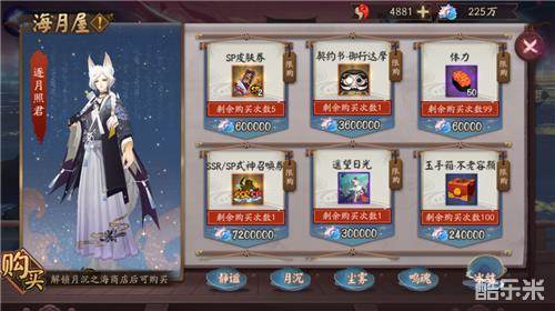 10月28日维护后-11月10日23:59,阴阳师们需要解锁每个海域的海月屋才可购买其他海域的商品。使用永生贝可在商店中兑换妖狐皮肤·逐月照君、SSR/SP式神召唤券、御行达摩、神秘的符咒,内含不同奖励的玉手箱、动态头像框“沉没之海”等奖励。