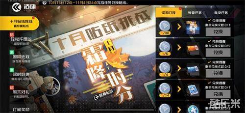 在“十月贴纸挑战”活动中,玩家通过完成任务积累挑战币,消耗挑战币即可兑换活动奖励。奖励包括“永久贴纸-天才少年·霜降时分”、“副本挑战券”、“熟练度加速卡”、“复活币”、“钻石”、“战备物资自选包”等。该活动将于11月4日24点结束。