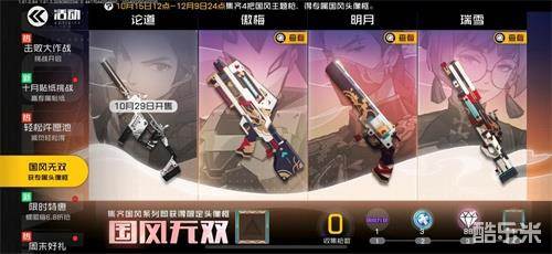 “国风无双”活动期间,玩家收集四把国风武器“蝶·傲梅”(限时特惠)、“迷雾·明月”(S6通行证)、“雪·瑞雪”(S6通行证)、“飞将·论道”(10月29日开售),即可解锁“国风无双专属头像框”、“称号-国风无双”、“复活币”、“钻石”等奖励。该活动将于12月9日24点结束。