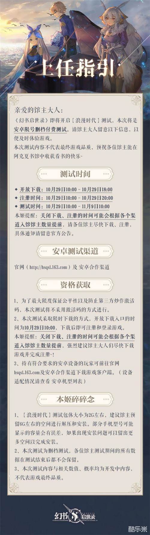 本次浪漫时代测试为安卓限号删档付费测试,今日10:00,各位馆主可前往游戏官网https://hsqsl.163.com/或其他安卓合作渠道,进行下载及注册。需要提醒馆主的是,本次采取限时下载的方式,关闭下载及注册的时间,会根据各个渠道进入馆主的数量提前,请馆主一定要尽快操作!