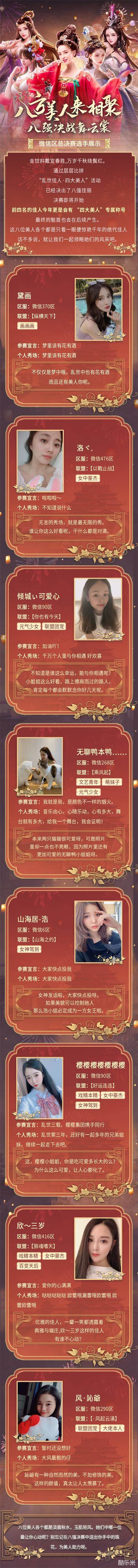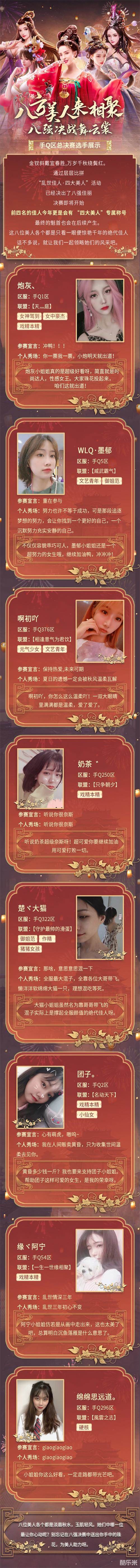 如今诞生的手Q区与微信区的各自八强美人更是经历的重重难关,从2.3万人的报名阶段,再到9000余人的海选阶段,紧接着进入32强入围赛,如今才艰难挺进8强踏入决赛,角逐最后的乱世美人桂冠。每一位佳人可谓身经百战,方能成为乱世中最璀璨的明星。